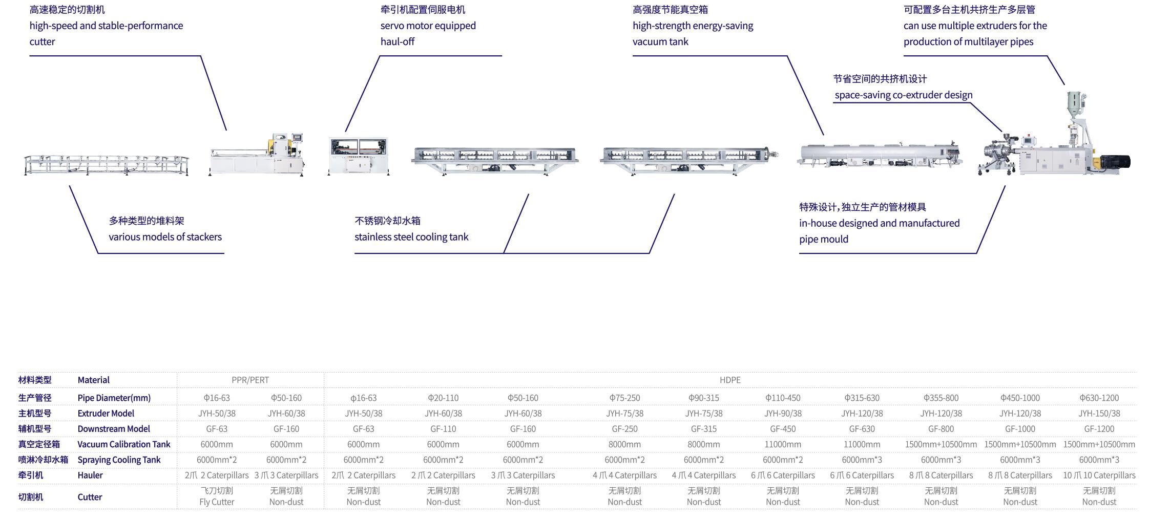 高效单螺杆挤出机→单螺杆共挤机→HDPE管材模具→真空冷却定径箱→喷淋冷却水箱→牵引机→切割机→翻料架(收卷机)