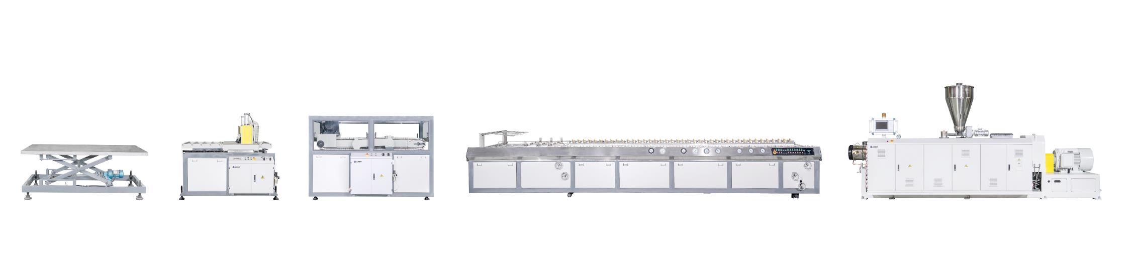 锥形双螺杆挤出机→PVC/WPC门板模具→真空冷却定型台→履带牵引机→切割机→堆料架